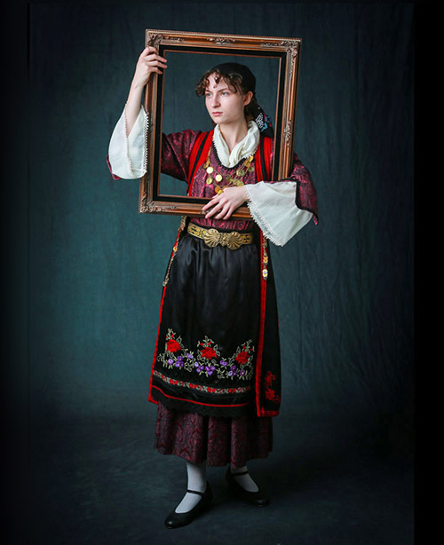 For me, what makes this outfit most special is that I can remember watching my mom sew and embroider, her hands moving deftly over the fabric, her dedication and long hours in the striking red pattern of the coat. As a performer, I wore this costume with great pride and it gives me joy to see my daughter don this family heirloom and remember our Greek roots.