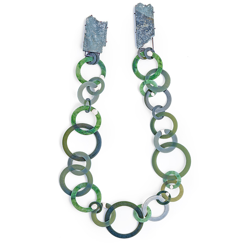 "Evergreen #3", pectoral piece, 2024. Nephrite from Qinghai province, sterling silver, copper, steel wire. Model: Zi Yan Wang. Photo: Han Chen.
