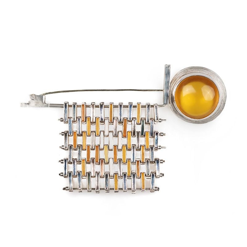 Vita Pukštaite-Bruže, "Reflection", brooch, 2017. Amber, silver, enamel, gold, mammoth bone. Courtesy of Lithuanian National Museum of Art.